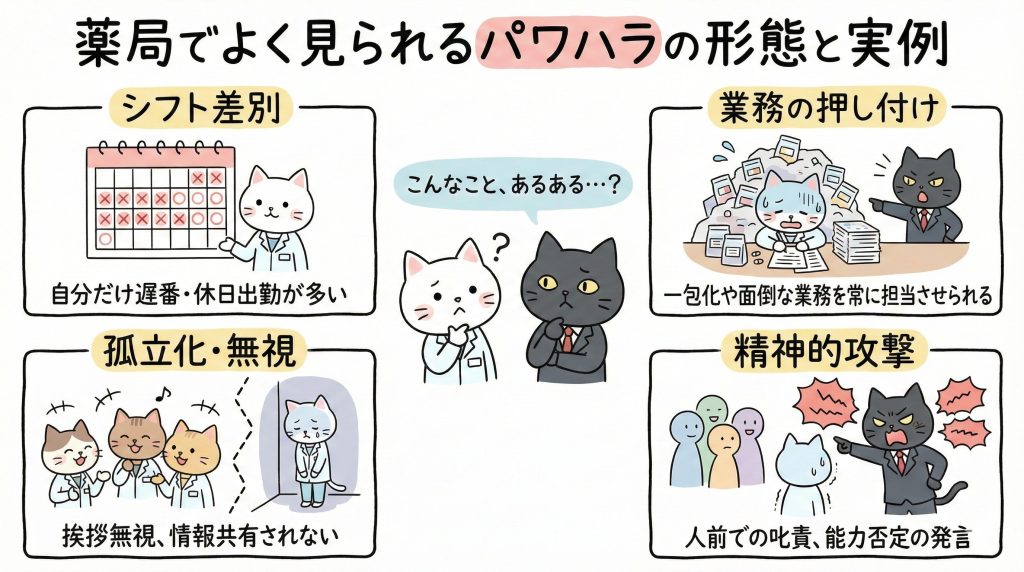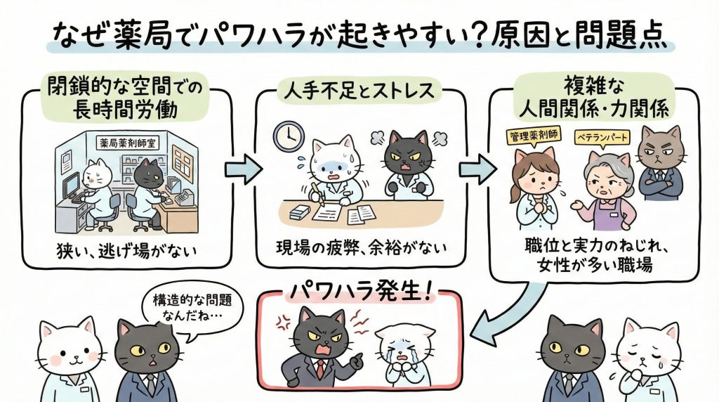 薬局でのパワハラって、意外と多いんだよね。特に最近は薬剤師不足で現場が疲弊してるから、余計にストレスが溜まってるんだ。