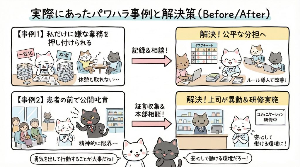 解決策: Bさんは業務の偏りを記録し、管理薬剤師に相談。改善が見られなかったため、本部の人事部に状況を報告。結果、業務の公平な分担ルールが導入され、状況が改善しました。