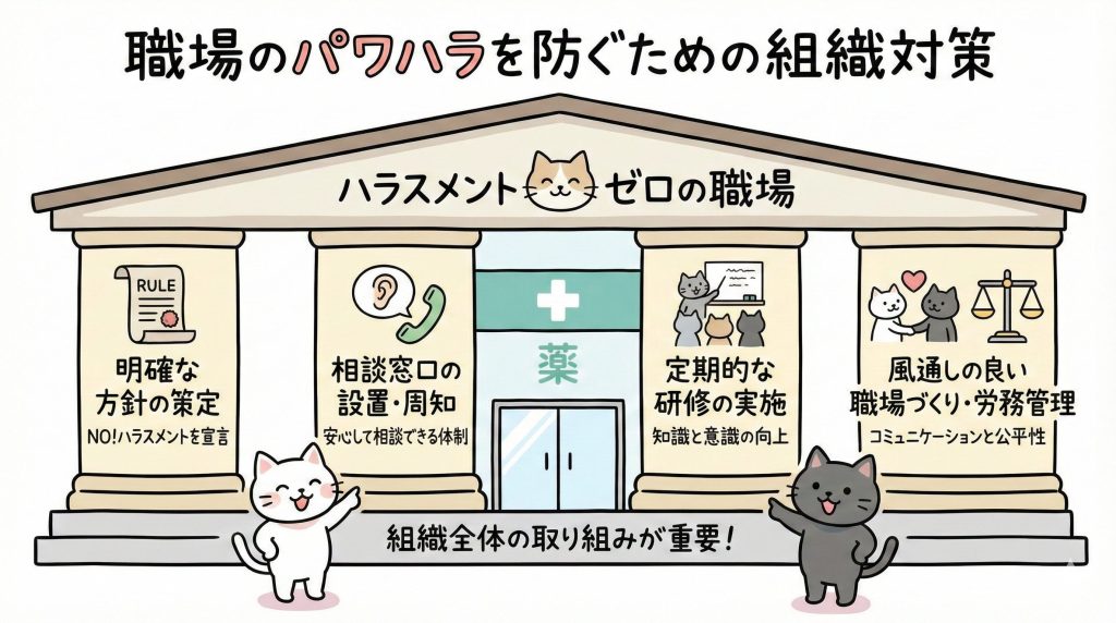 パワハラは個人の問題だけでなく、組織文化の問題でもあります。薬局や病院などの医療機関が組織としてパワハラを防止するための対策を紹介します。