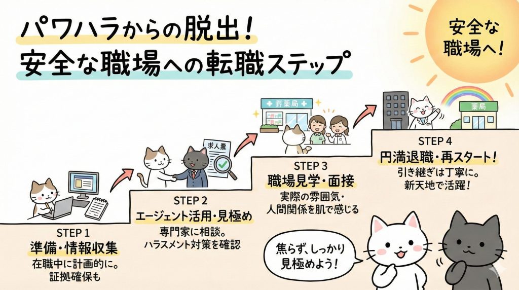 パワハラを理由に転職する場合、以下のステップで安全に進めましょう: