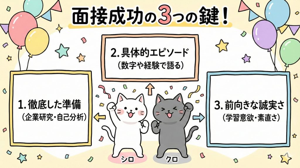 どんな細かい対策よりも、「自分らしさ」と「誠実さ」が一番大切だと思うよ。完璧を装うより、素直に自分の強みと弱みを理解して、成長意欲を示すことが採用担当者の心に響くんだ。