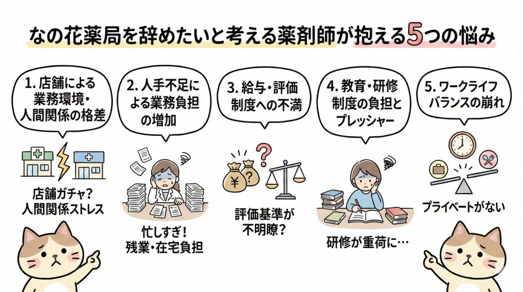 私も薬剤師として調剤薬局チェーンで勤務した経験から、現場で感じる課題や悩みについて理解しています。まずは、なの花薬局で働く薬剤師が「辞めたい」と感じる主な理由について見ていきましょう。