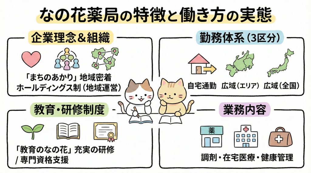 なの花薬局はホールディングカンパニー制を採用し、地域ごとに「なの花北海道」「なの花東日本」「なの花西日本」などの運営会社を置いています。これは地域のニーズに合わせた薬局づくりを目指す仕組みですが、その反面、店舗によって業務環境や人間関係に大きな差が生じやすいという特徴があります。