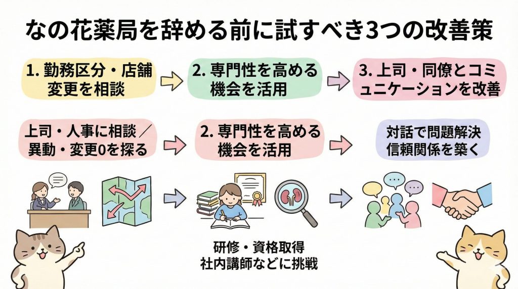 なの花薬局は全国に460店舗以上を展開する大手チェーンであり、様々な働き方や環境が存在します。すぐに退職を決断する前に、現在の環境を改善できる可能性がないか探ってみましょう。