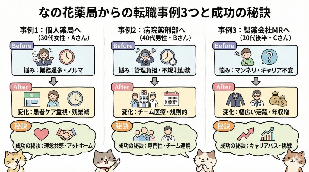 これらの事例が示すように、なの花薬局での経験は次のキャリアステップにおいても十分に活かすことができます。大切なのは、自分の価値観や希望するワークスタイルを明確にし、それに合った環境を見つけることです。転職は単なる「逃げ」ではなく、自分のキャリアを主体的に選び取る積極的な選択として捉えましょう。