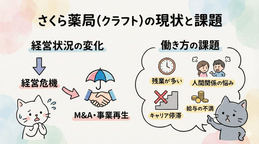 クラフト株式会社は、M&Aを積極的に進めてチェーン化を図ってきましたが、その過程で多額の負債を抱えることになりました。さらに2020年のコロナ禍による来局患者数の減少で売上高が減少し、経営状況が悪化。これにより職場の雰囲気も不安定になり、将来への不安を感じる薬剤師が増えています。
