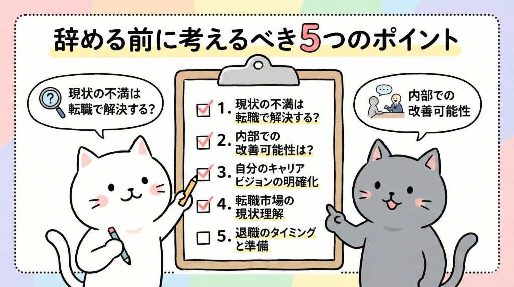 さくら薬局を辞めたいと感じたとき、すぐに行動するのではなく、まずは冷静に状況を分析することが重要です。以下の5つのポイントを確認し、本当に転職すべきかどうかを判断しましょう。