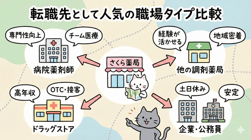 さくら薬局からの転職を考える際、どのような職場が適しているのかを比較検討することが重要です。以下に主な転職先の特徴をまとめました。