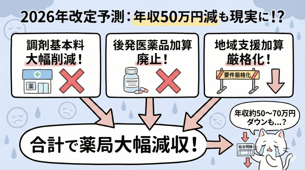 - 2026年改定では、調剤基本料削減、後発調剤体制加算廃止、地域支援体制加算見直しが予想される