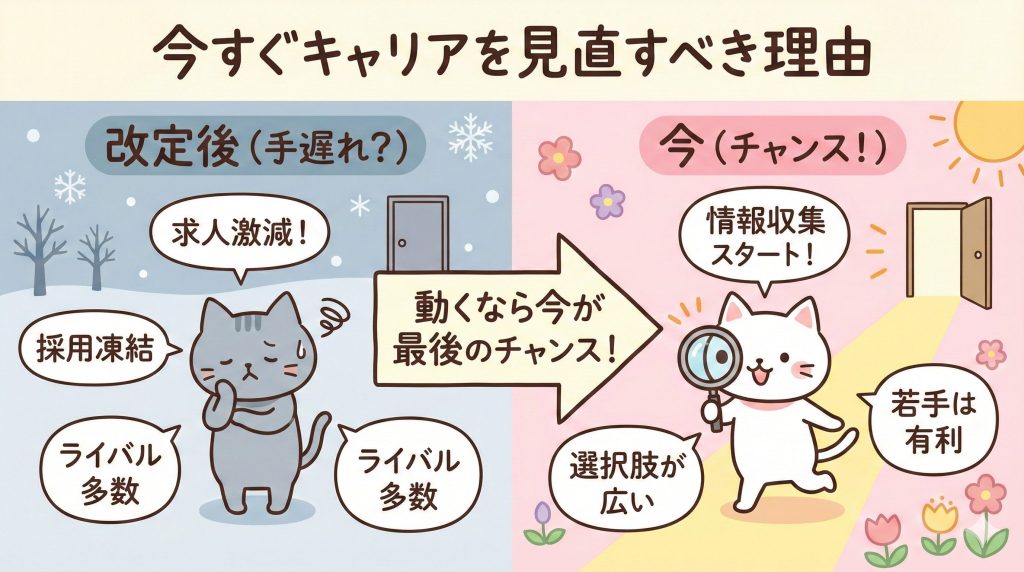 2026年改定後は、この動きがさらに加速するでしょう。転職市場が冷え込む前に動くことが重要です。