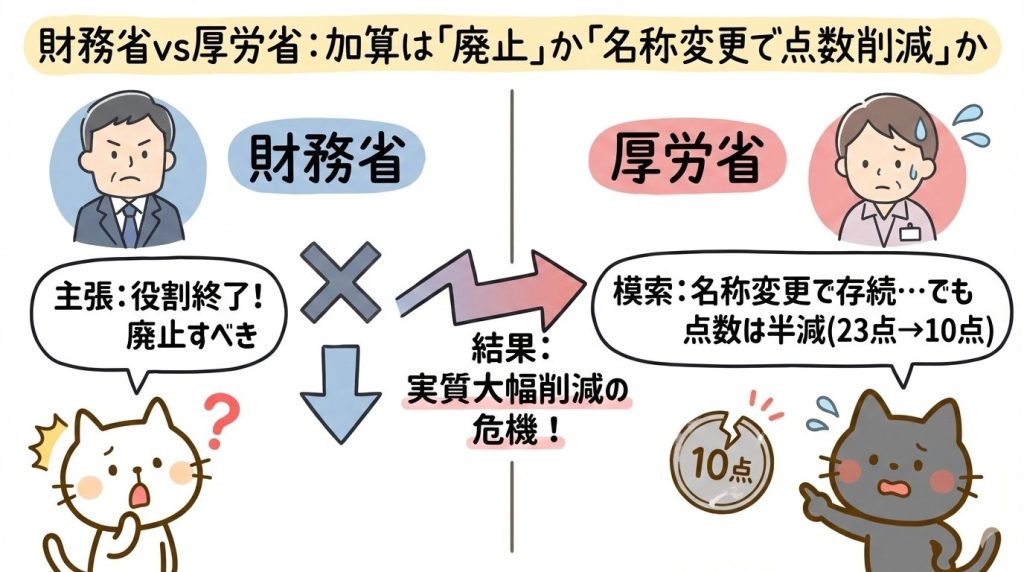 財務省vs厚労省:加算は「廃止」か「名称変更で点数削減」か