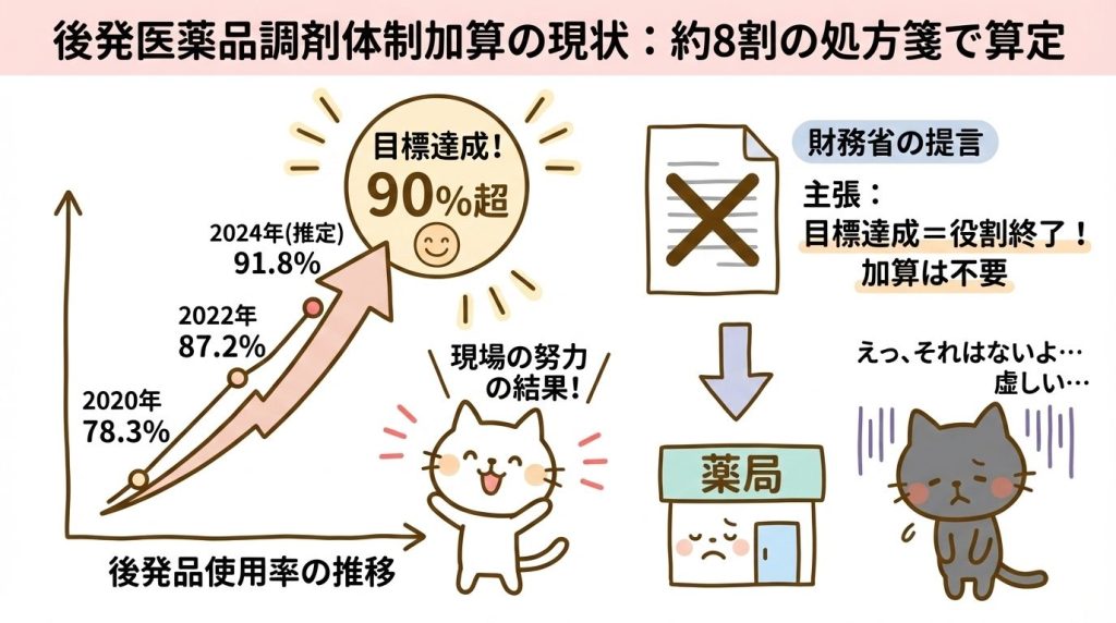 財務省の主張: 「後発医薬品の使用割合は既に9割を超えており、調剤体制加算は役割を終えた」→ 廃止すべき