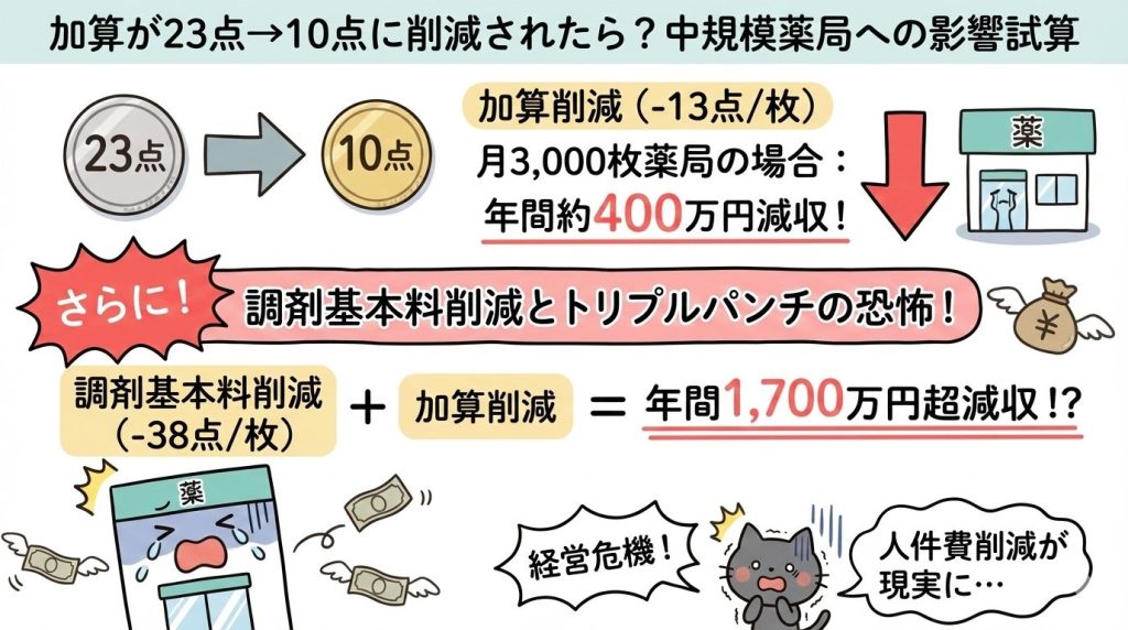 財務省が「役割終了」と断言し、厚労省は別名称で存続を模索。しかし点数は23点→10点程度に大幅削減の見込み。約8割の処方箋で算定されてきた加算が半減すれば、月3,000枚の薬局で年間400万円超の減収に。