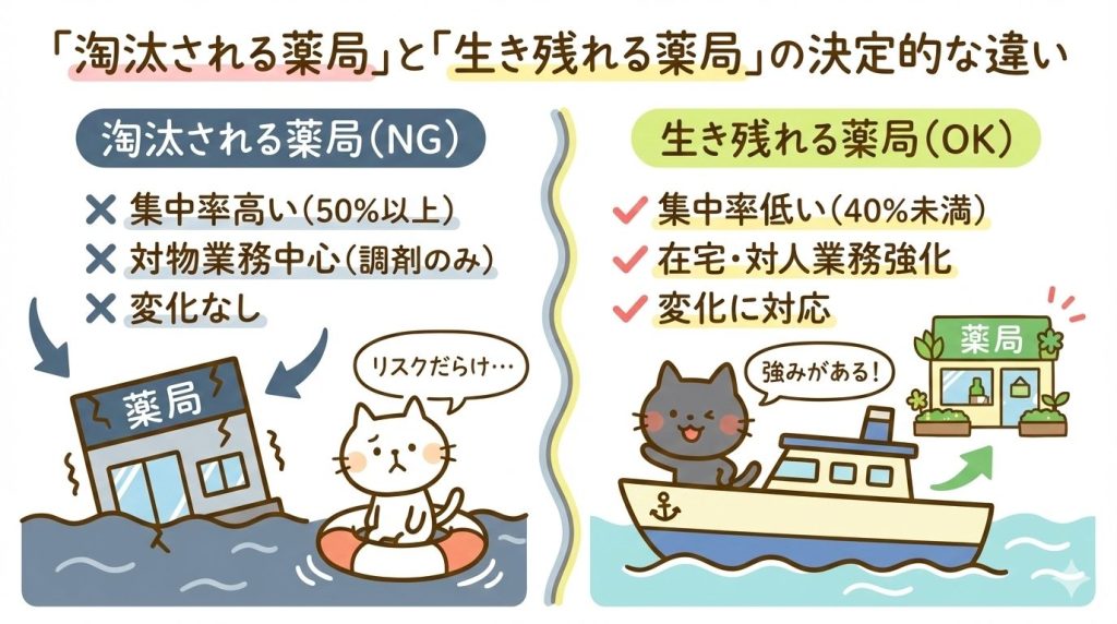 - 「淘汰される薬局」と「生き残れる薬局」の差は、処方箋集中率・在宅医療・対人業務の実績