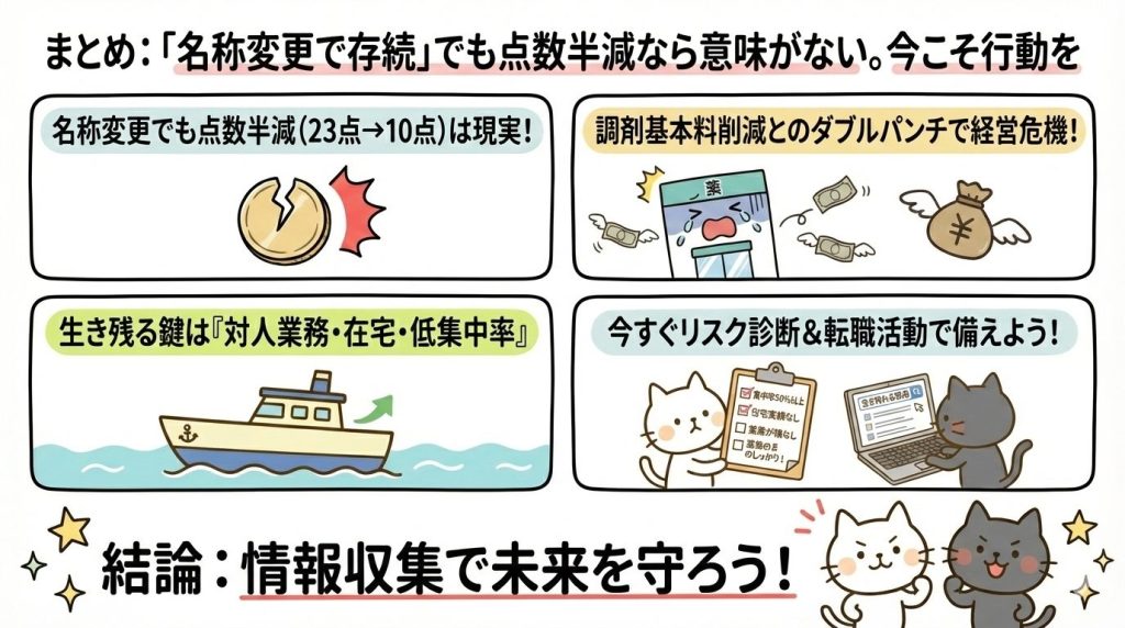 まとめ:「名称変更で存続」でも点数半減なら意味がない。今こそ行動を