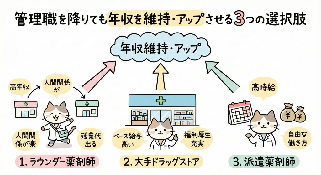 「管理薬剤師を辞めたら年収が下がる」と思い込んでいませんか? 実は、ヒラ(一般薬剤師)に戻っても高年収を狙える働き方はあります。