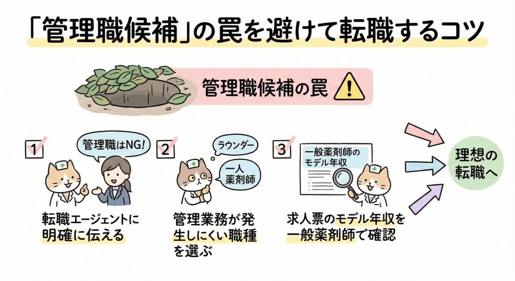 – 「年収は維持したいが、役職は不要」という条件を最初に提示しましょう。 - 「ラウンダー」や「一人薬剤師」など、管理業務が発生しにくい職種を選ぶ