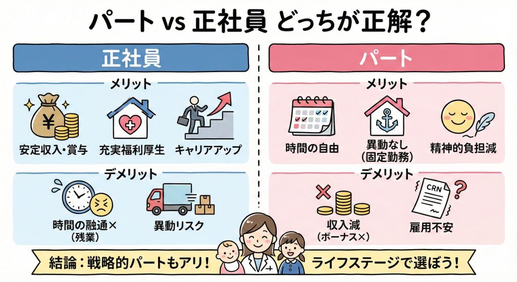 無理して正社員にしがみついて体を壊したら元も子もないよ。子供が小さいうちはパート、大きくなったら正社員に戻るっていう「戦略的パート」もアリだね。
