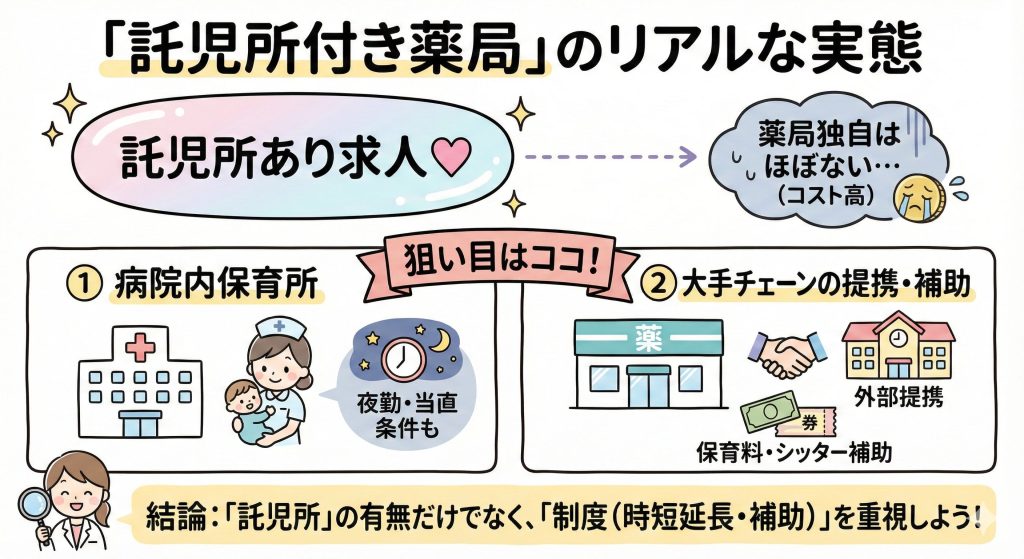 - 病院薬剤師: 院内保育所が利用できるケースが多いですが、夜勤や当直が条件になることも。