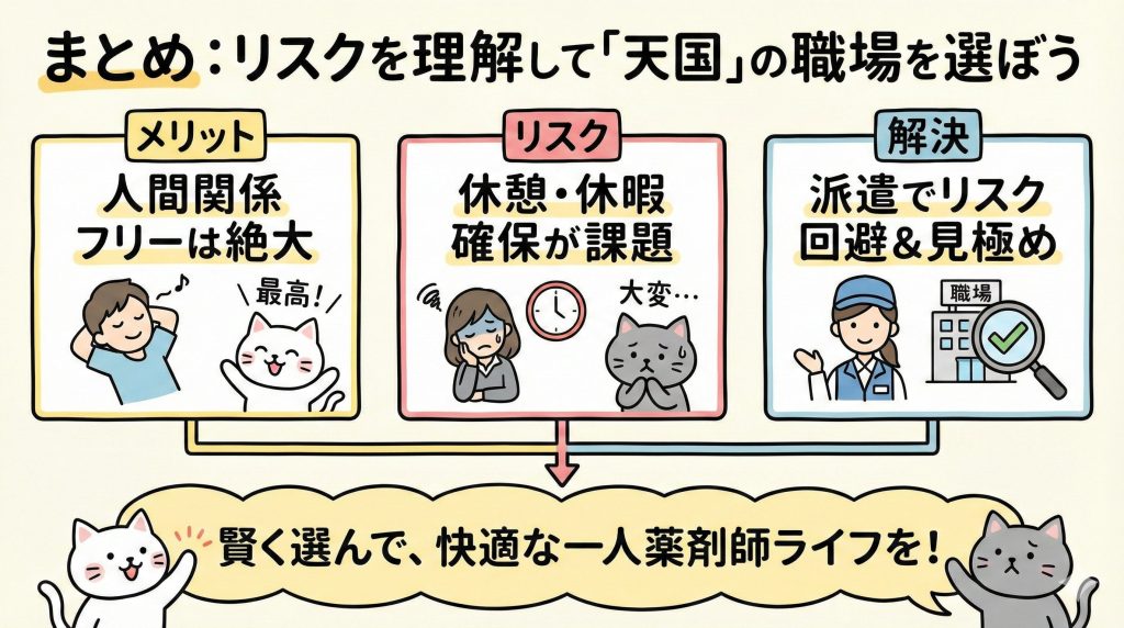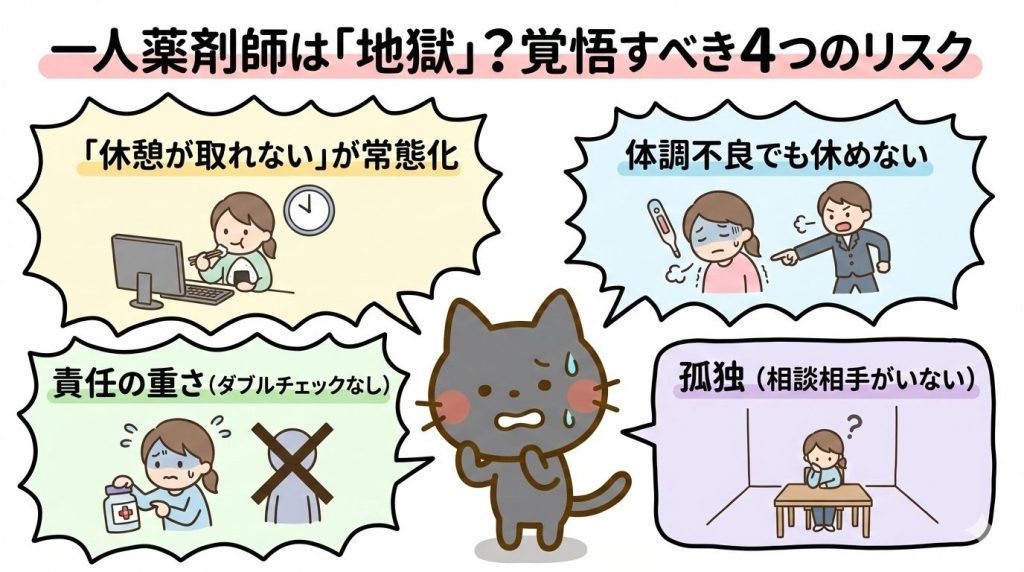 一人薬剤師は、人間関係の悩みから解放される素晴らしい働き方ですが、環境選びを間違えると過酷な労働環境に陥るリスクもあります。