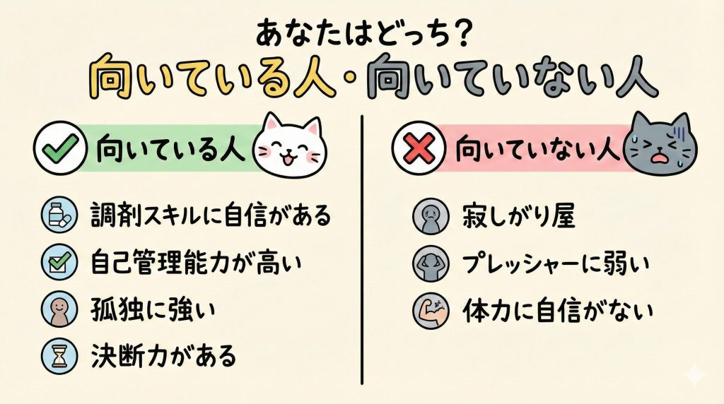 | 責任の重さ | 調剤過誤のダブルチェックができず、全責任を負う | ★★★★☆ |