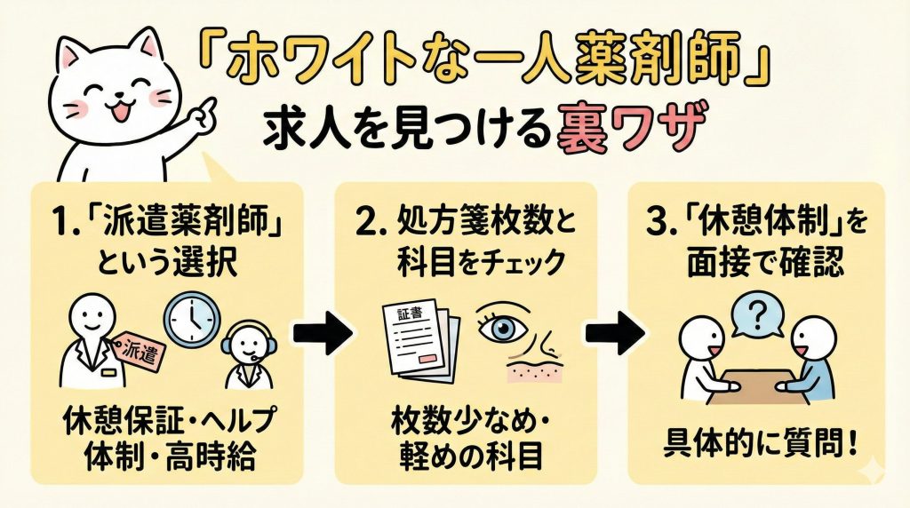 - 休憩や休みが確保できる「ホワイトな一人薬剤師求人」の探し方