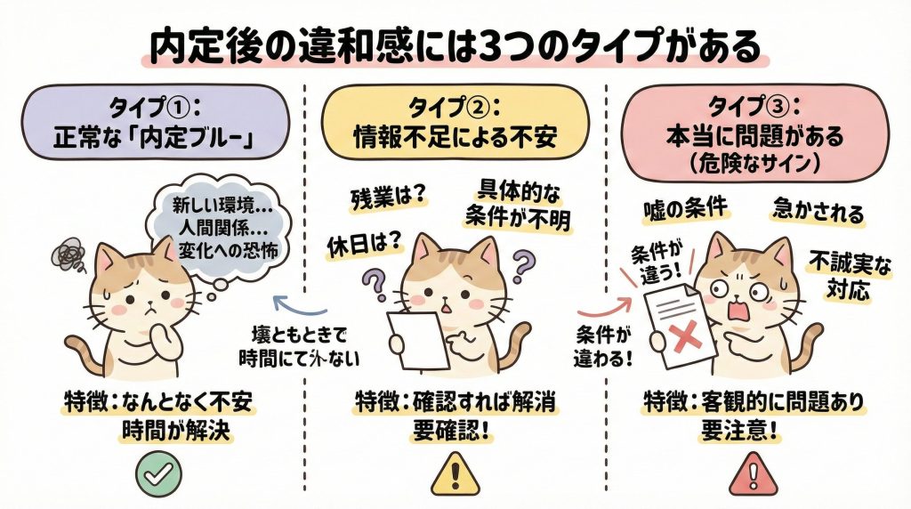 内定後に感じる違和感は、大きく分けて3つのタイプに分類できます。まずは自分の不安がどれに当てはまるかチェックしましょう。