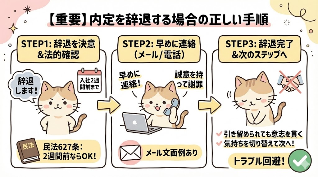 - 法的に可能:入社2週間前までなら民法上も辞退可能です(ただし1ヶ月前が望ましい)。