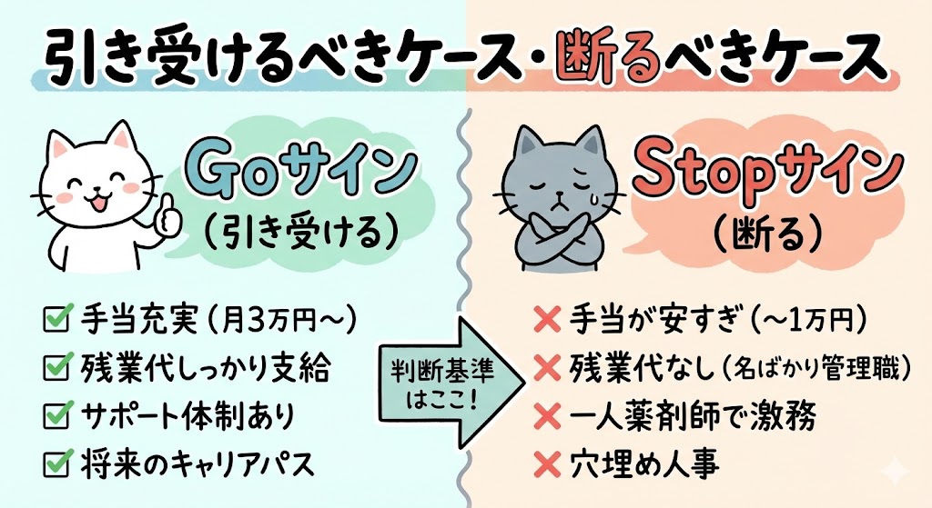管理薬剤師になると責任が重くなりますが、それに見合う対価が必要です。提示された手当が「月5,000円〜1万円」程度であれば、業務量に対して割に合わない可能性が高いです。