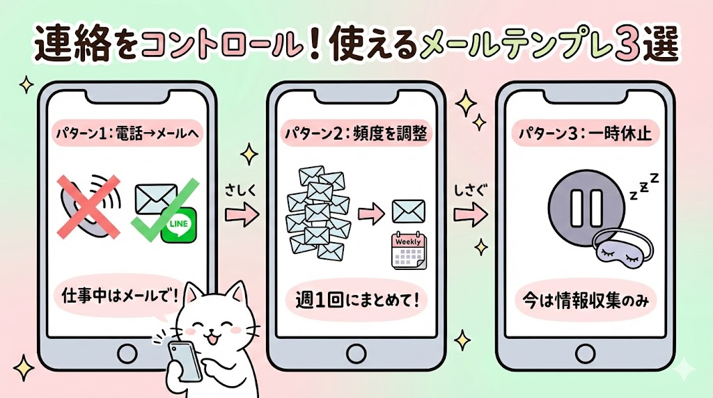 • 断る勇気を持つ:テンプレを使って、事務的に一時休止や担当変更を申し出る。