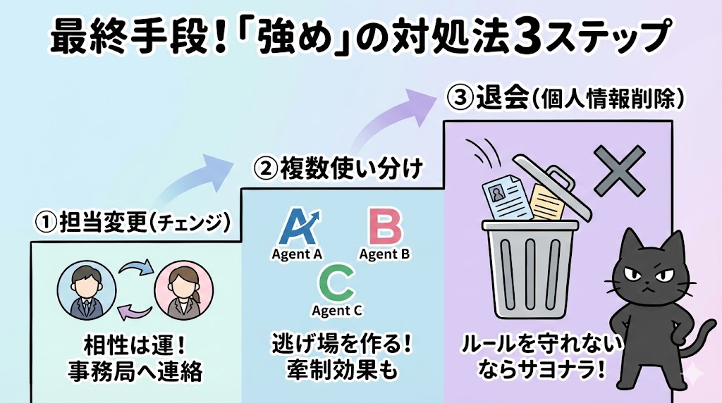 最終手段です。ルールを守れない会社とは付き合う必要はありません。「退会します。個人情報の削除をお願いします」と事務局へ伝えれば、法的に彼らは連絡できなくなります。
