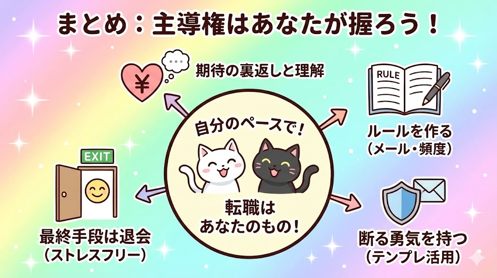 これらを実践するだけで、毎日の着信ストレスは驚くほど減ります。転職活動は、あなたの人生をより良くするためのものです。自分のペースで、心に余裕を持って進められる環境を整えましょう。
