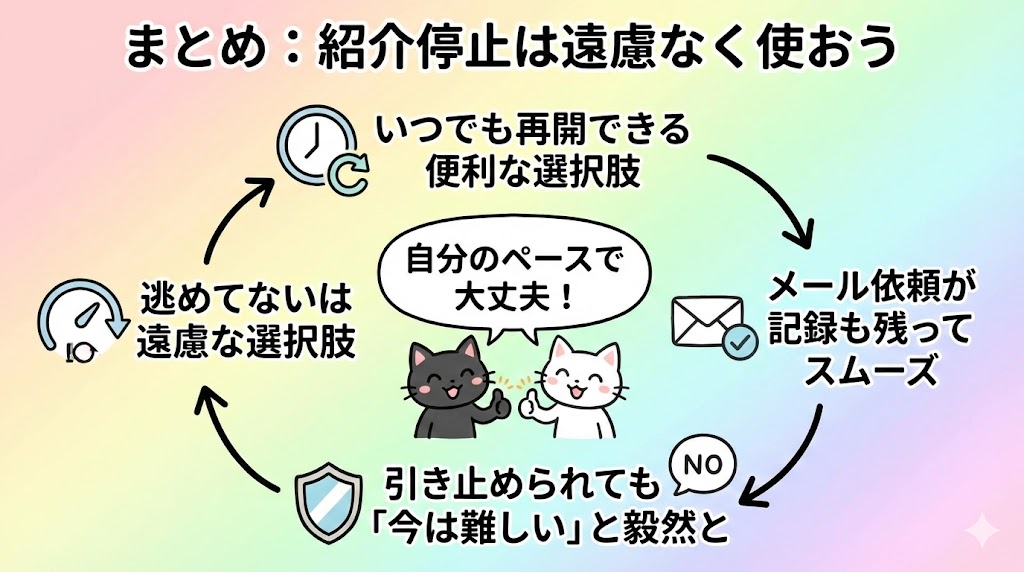 クロ: 紹介停止は「一時停止ボタン」みたいなものだよ。いつでも再開できるから気軽に使っていいんだ。