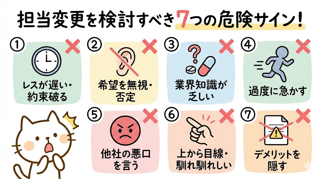 以下のサインが1つでも当てはまるなら、黄色信号。複数当てはまるなら、即座に担当変更かエージェントの乗り換えをおすすめします。