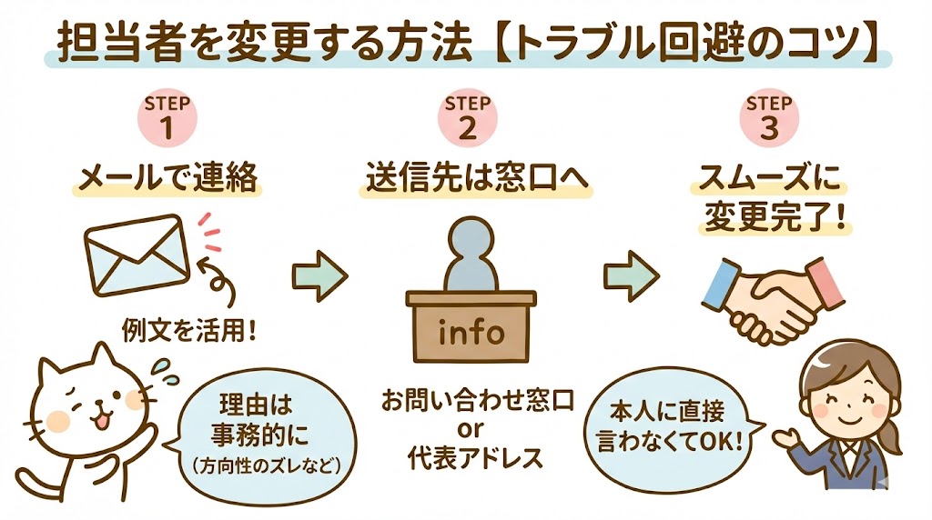 担当変更は、メールまたは専用フォームで行うのが鉄則です。電話だと引き止められたり、言いたいことが言えなかったりするからです。
