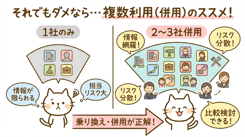 • 相性リスクの分散: A社の担当がダメでも、B社の担当が優秀なら問題ありません。