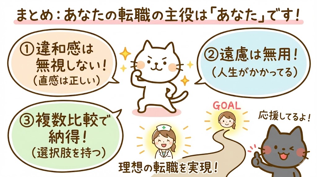 良い担当者に出会えれば、転職活動は驚くほどスムーズに進み、結果も良くなります。勇気を出して環境を整え、納得のいく転職を実現しましょう。