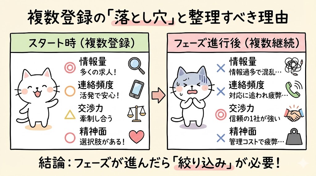 多くのメディアでは「複数登録」が推奨されていますが、それはあくまで「比較検討するため」の手段であって、目的ではありません。ずっと複数社を使い続けることには、明確なデメリットが存在します。