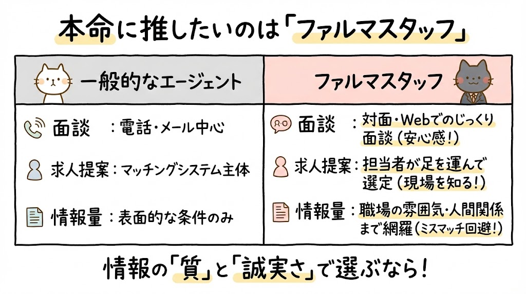 もしまだファルマスタッフに登録していない場合は、このタイミングで登録し、一度面談を受けて比較してみるのが良いでしょう。他社との「対応の深さ」の違いに驚くはずです。