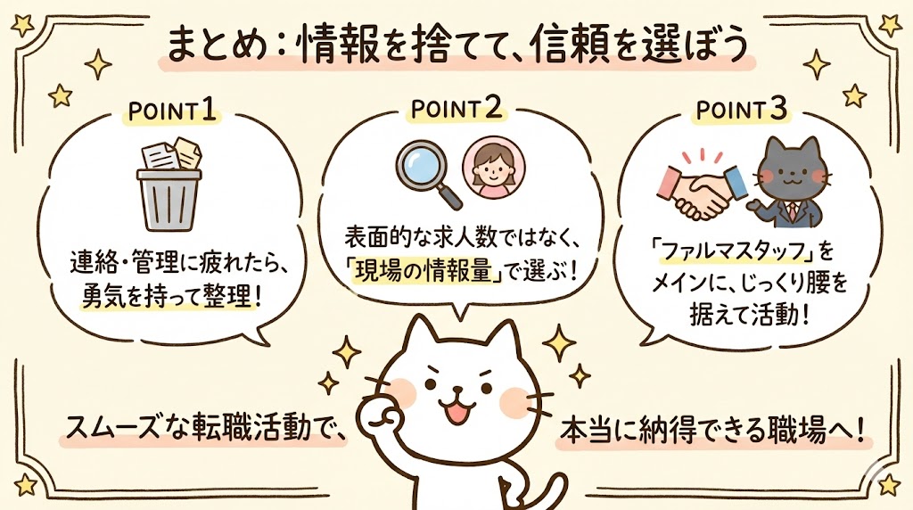 薬剤師の転職活動において、「情報の多さ」は武器になりますが、抱え込みすぎると「重荷」になります。