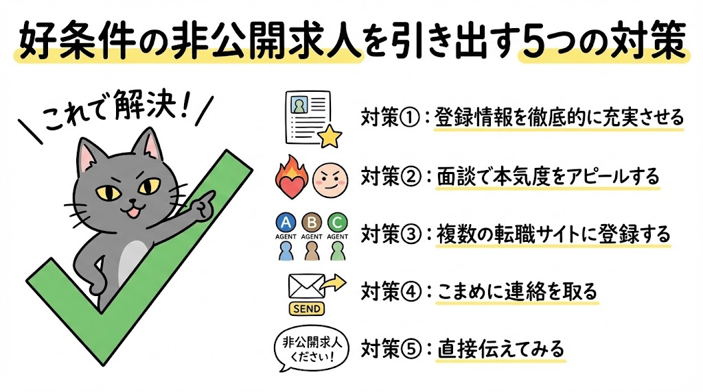 よし、ここからは「好条件の非公開求人を引き出す5つの対策」を教えるよ!