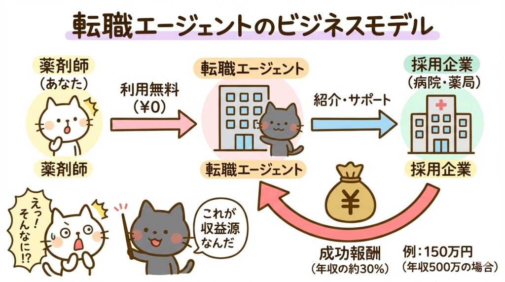 転職エージェントのサービスは薬剤師にとって無料ですが、これは慈善事業ではありません。マイナビ薬剤師やファルマスタッフなどの転職支援サイトは、「成功報酬型」のビジネスモデルで運営されています。