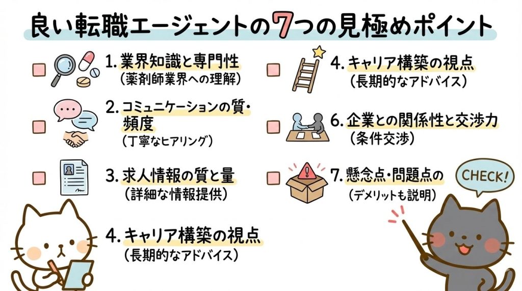 薬剤師の転職では、良いエージェントを見つけることが本当に大切だよ!今日紹介した7つのポイントをチェックして、自分に合ったエージェントを選んでね。