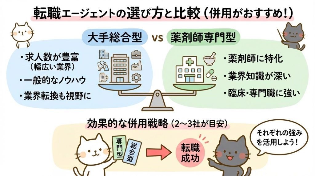 転職エージェントは1社だけじゃなくて、薬剤師専門のところと大手の総合型を掛け持ちするのがベストだよ!それぞれ得意分野が違うからね。