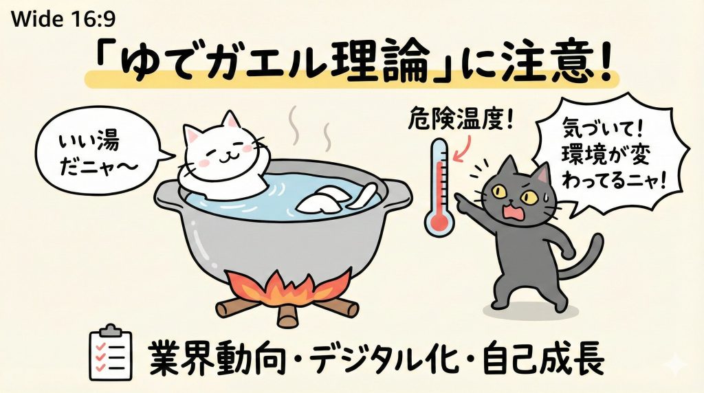 まず「ゆでガエル理論」を知っておくといいよ。カエルを熱湯に入れるとすぐに飛び出すけど、常温の水に入れて徐々に温度を上げると気づかずに茹で上がってしまうっていう話。薬剤師業界も同じで、日々の忙しさに追われていると自分の置かれている状況の変化に気づかないことがあるんだ。