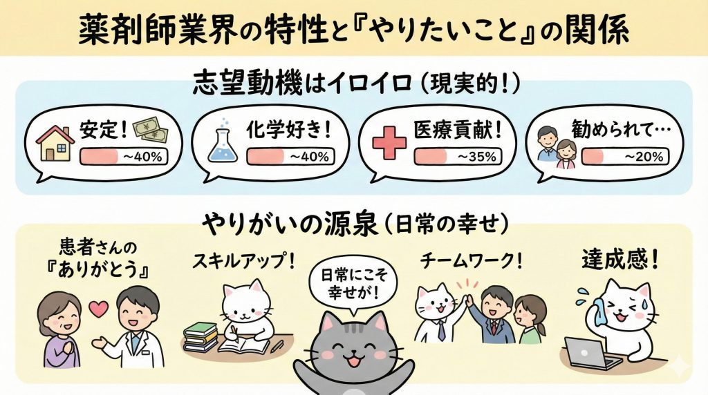 薬剤師業界には、「やりたいこと」と職業選択の関係において特徴的な点があります。