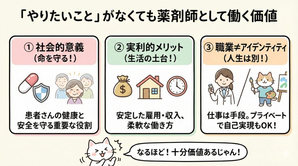 仕事は収入を得るための手段であり、本当の自己実現はプライベートの時間で追求するという選択肢も十分にあります。薬剤師として働きながら、趣味や家族との時間、地域活動などで充実した人生を送ることは可能です。