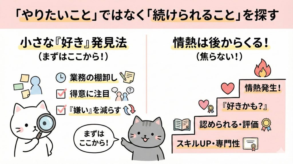 「やりたいこと」を探し続けるよりも、「続けられること」を見つけるアプローチが効果的な場合があります。