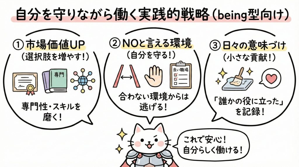 being型の人が職業に満足して長く続けるために最も重要なのは、「仕事でつく嘘を最小化すること」です。具体的には: